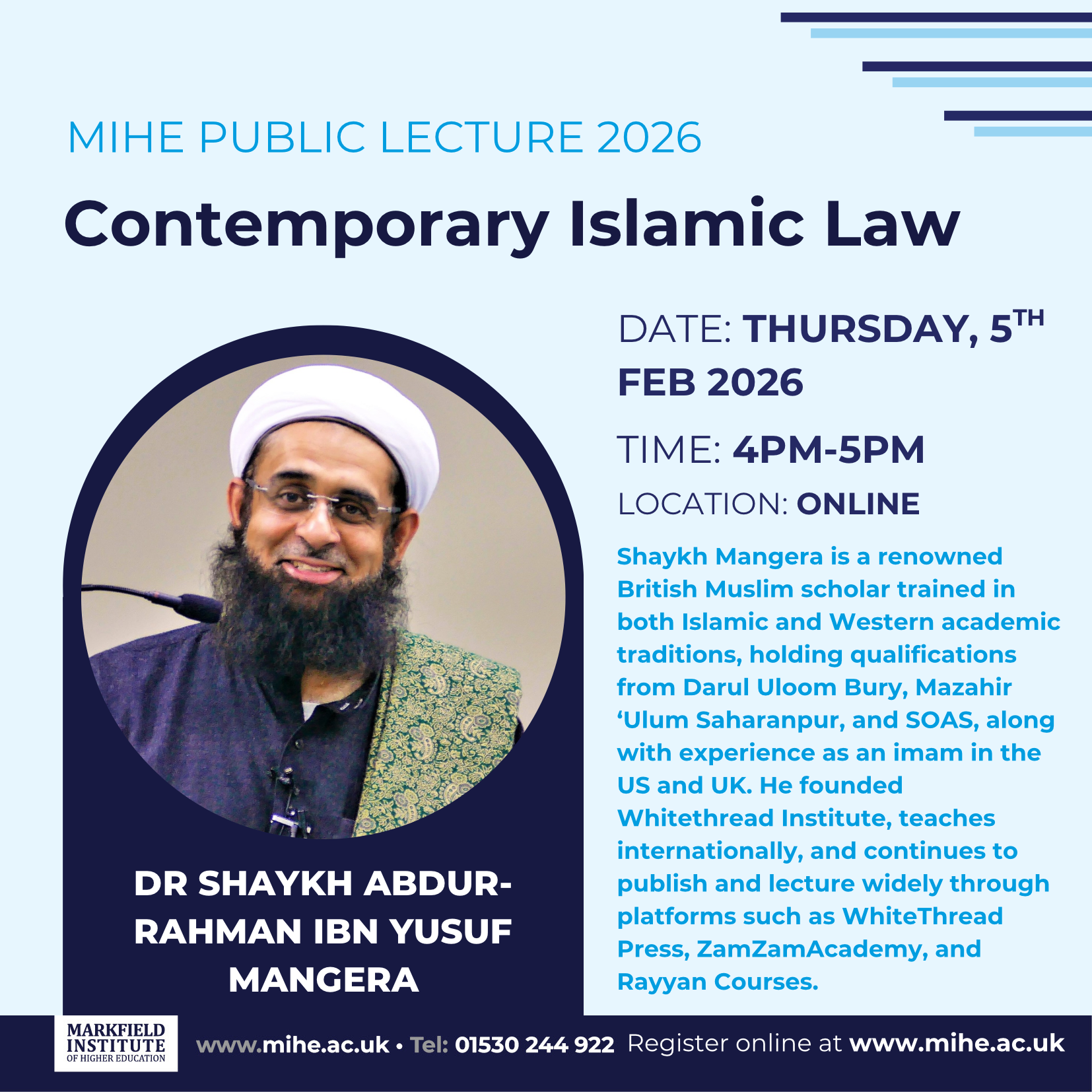 Dr. Shaykh Abdur-Rahman ibn Yusuf Mangera is a British Muslim scholar trained in both Islamic and Western academic traditions, holding qualifications from Darul Uloom Bury, Mazahir ‘Ulum Saharanpur, and SOAS, along with experience as an imam in the US and UK. He founded Whitethread Institute, teaches internationally, and continues to publish and lecture widely through platforms such as WhiteThread Press, ZamZamAcademy, and Rayyan Courses.